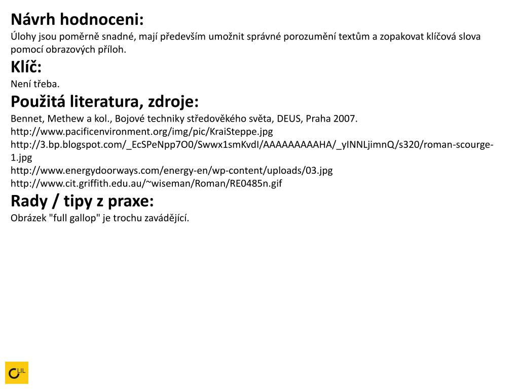 Návrh hodnoceni: Úlohy jsou poměrně snadné, mají především umožnit správné porozumění textům a zopakovat klíčová slova pomocí obrazových příloh.Klíč: Není třeba.Použitá literatura, zdroje: Bennet, Methew a kol., Bojové techniky středověkého světa, DEUS, Praha 2007. http://www.pacificenvironment.org/img/pic/KraiSteppe.jpg http://3.bp.blogspot.com/_EcSPeNpp7O0/Swwx1smKvdI/AAAAAAAAAHA/_yINNLjimnQ/s320/roman-scourge-1.jpg http://www.energydoorways.com/energy-en/wp-content/uploads/03.jpg http://www.cit.griffith.edu.au/~wiseman/Roman/RE0485n.gif Rady / tipy z praxe: Obrázek "full gallop" je trochu zavádějící.