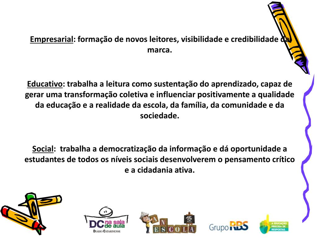 Empresarial: formação de novos leitores, visibilidade e credibilidade da marca. Educativo: trabalha a leitura como sustentação do aprendizado, capaz de gerar uma transformação coletiva e influenciar positivamente a qualidade da educação e a realidade da escola, da família, da comunidade e da sociedade. Social: trabalha a democratização da informação e dá oportunidade a estudantes de todos os níveis sociais desenvolverem o pensamento crítico e a cidadania ativa.