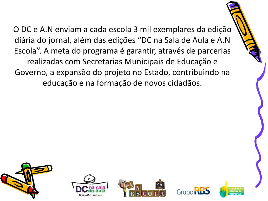 O DC e A.N enviam a cada escola 3 mil exemplares da edição diária do jornal, além das edições “DC na Sala de Aula e A.N Escola”. A meta do programa é garantir, através de parcerias realizadas com Secretarias Municipais de Educação e Governo, a expansão do projeto no Estado, contribuindo na educação e na formação de novos cidadãos.