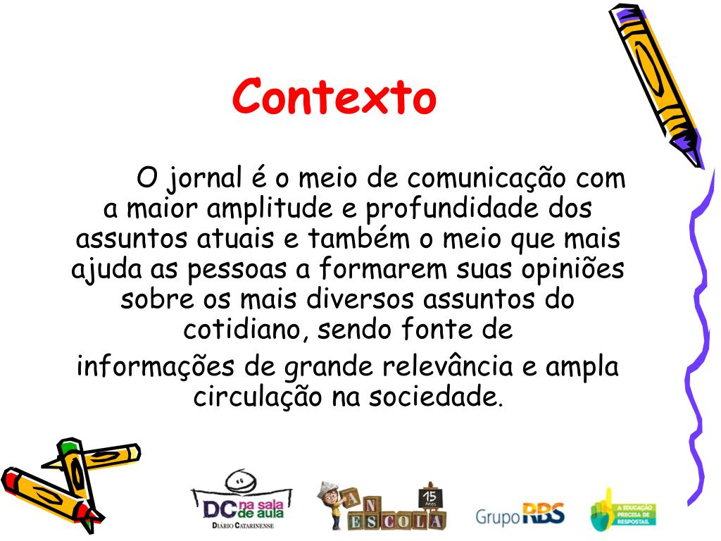 Contexto O jornal é o meio de comunicação com a maior amplitude e profundidade dos assuntos atuais e também o meio que mais ajuda as pessoas a formarem suas opiniões sobre os mais diversos assuntos do cotidiano, sendo fonte de informações de grande relevância e ampla circulação na sociedade.