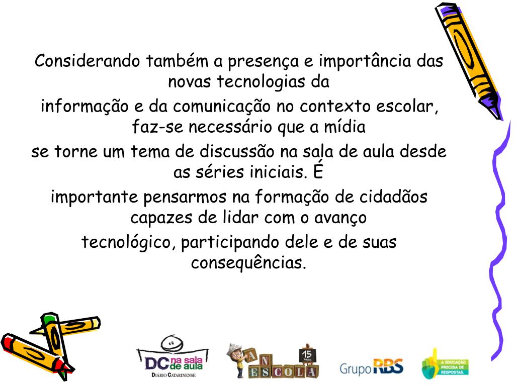 Considerando também a presença e importância das novas tecnologias da informação e da comunicação no contexto escolar, faz-se necessário que a mídia se torne um tema de discussão na sala de aula desde as séries iniciais. É importante pensarmos na formação de cidadãos capazes de lidar com o avanço tecnológico, participando dele e de suas consequências.