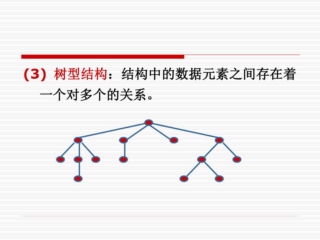 (3) 树型结构:结构中的数据元素之间存在着一个对多个的关系。