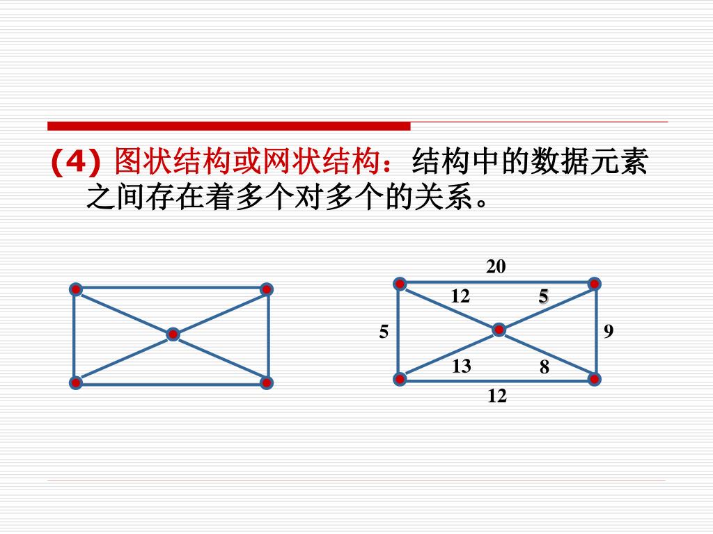20 12 5 5 9 13 8 12 (4) 图状结构或网状结构:结构中的数据元素之间存在着多个对多个的关系。