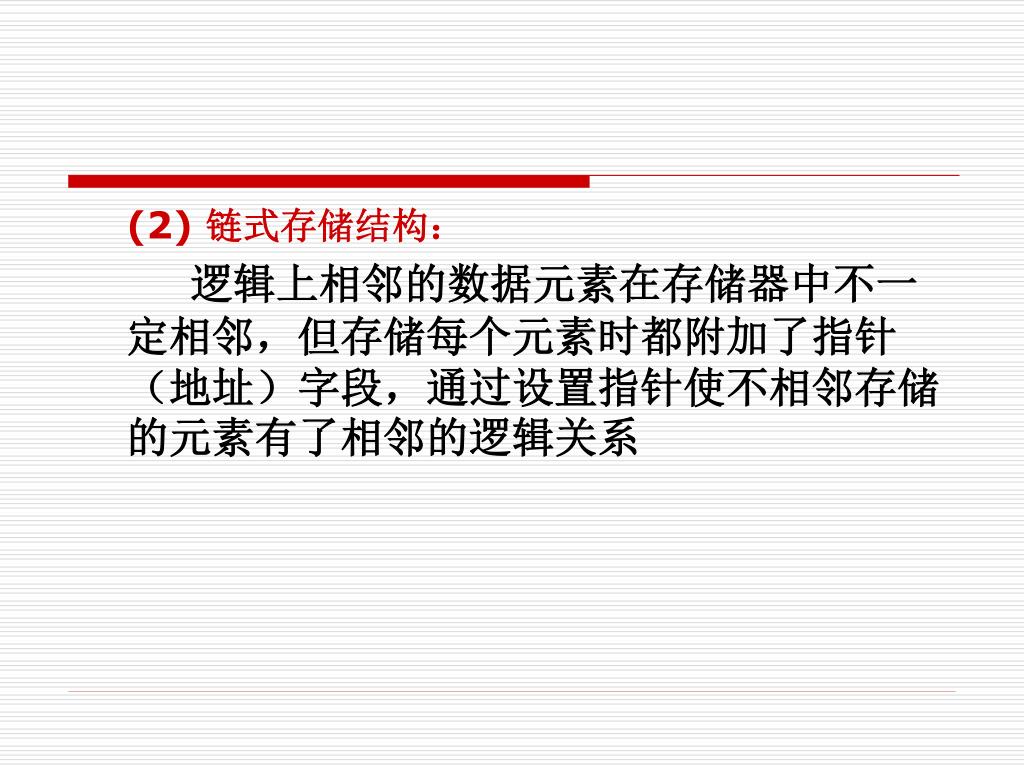 (2) 链式存储结构: 逻辑上相邻的数据元素在存储器中不一定相邻,但存储每个元素时都附加了指针(地址)字段,通过设置指针使不相邻存储的元素有了相邻的逻辑关系