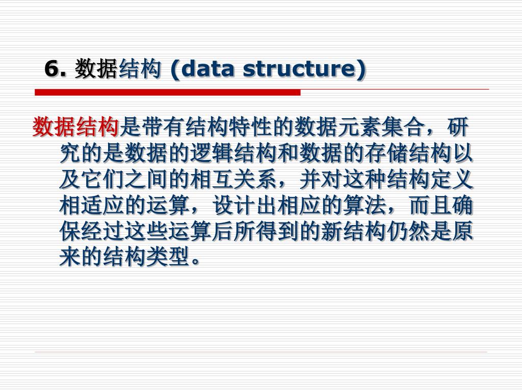 6. 数据结构 (data structure) 数据结构是带有结构特性的数据元素集合,研究的是数据的逻辑结构和数据的存储结构以及它们之间的相互关系,并对这种结构定义相适应的运算,设计出相应的算法,而且确保经过这些运算后所得到的新结构仍然是原来的结构类型。