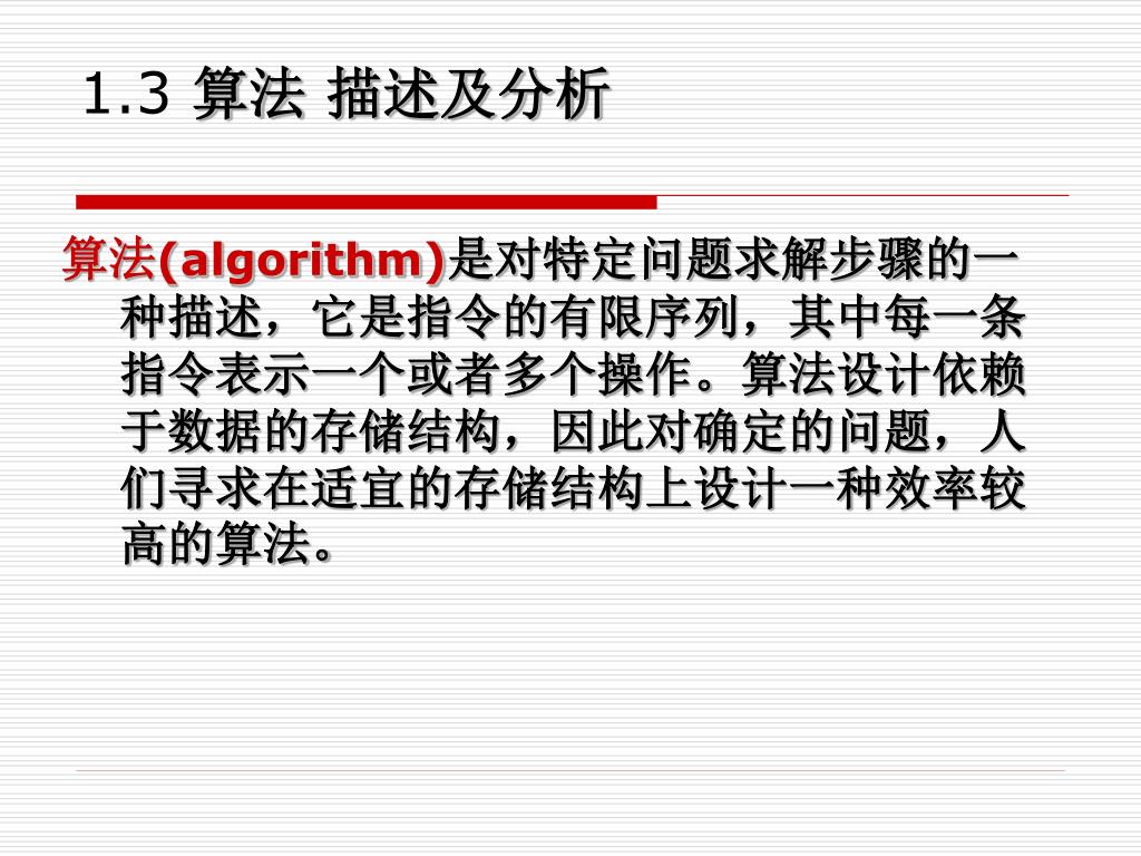 1.3算法 描述及分析 算法(algorithm)是对特定问题求解步骤的一种描述,它是指令的有限序列,其中每一条指令表示一个或者多个操作。算法设计依赖于数据的存储结构,因此对确定的问题,人们寻求在适宜的存储结构上设计一种效率较高的算法。