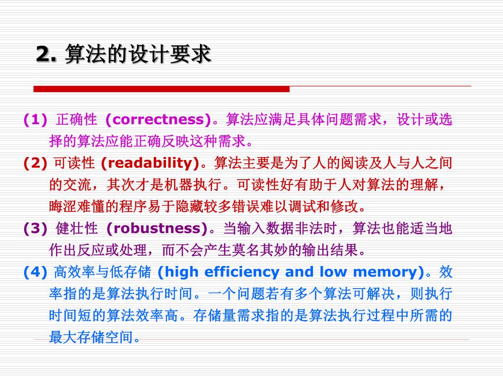 2. 算法的设计要求 (1) 正确性 (correctness)。算法应满足具体问题需求,设计或选择的算法应能正确反映这种需求。 (2) 可读性 (readability)。算法主要是为了人的阅读及人与人之间的交流,其次才是机器执行。可读性好有助于人对算法的理解,晦涩难懂的程序易于隐藏较多错误难以调试和修改。 (3) 健壮性 (robustness)。当输入数据非法时,算法也能适当地作出反应或处理,而不会产生莫名其妙的输出结果。 (4) 高效率与低存储 (high efficiency and low memory)。效率指的是算法执行时间。一个问题若有多个算法可解决,则执行时间短的算法效率高。存储量需求指的是算法执行过程中所需的最大存储空间。
