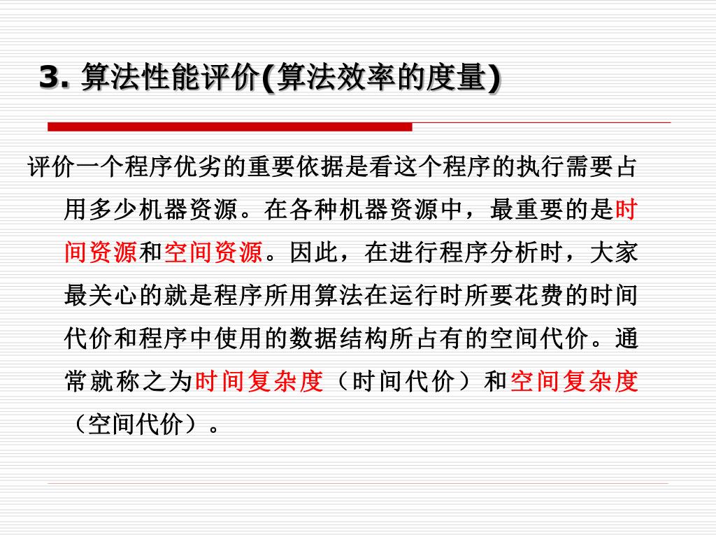 3. 算法性能评价(算法效率的度量) 评价一个程序优劣的重要依据是看这个程序的执行需要占用多少机器资源。在各种机器资源中,最重要的是时间资源和空间资源。因此,在进行程序分析时,大家最关心的就是程序所用算法在运行时所要花费的时间代价和程序中使用的数据结构所占有的空间代价。通常就称之为时间复杂度(时间代价)和空间复杂度(空间代价)。