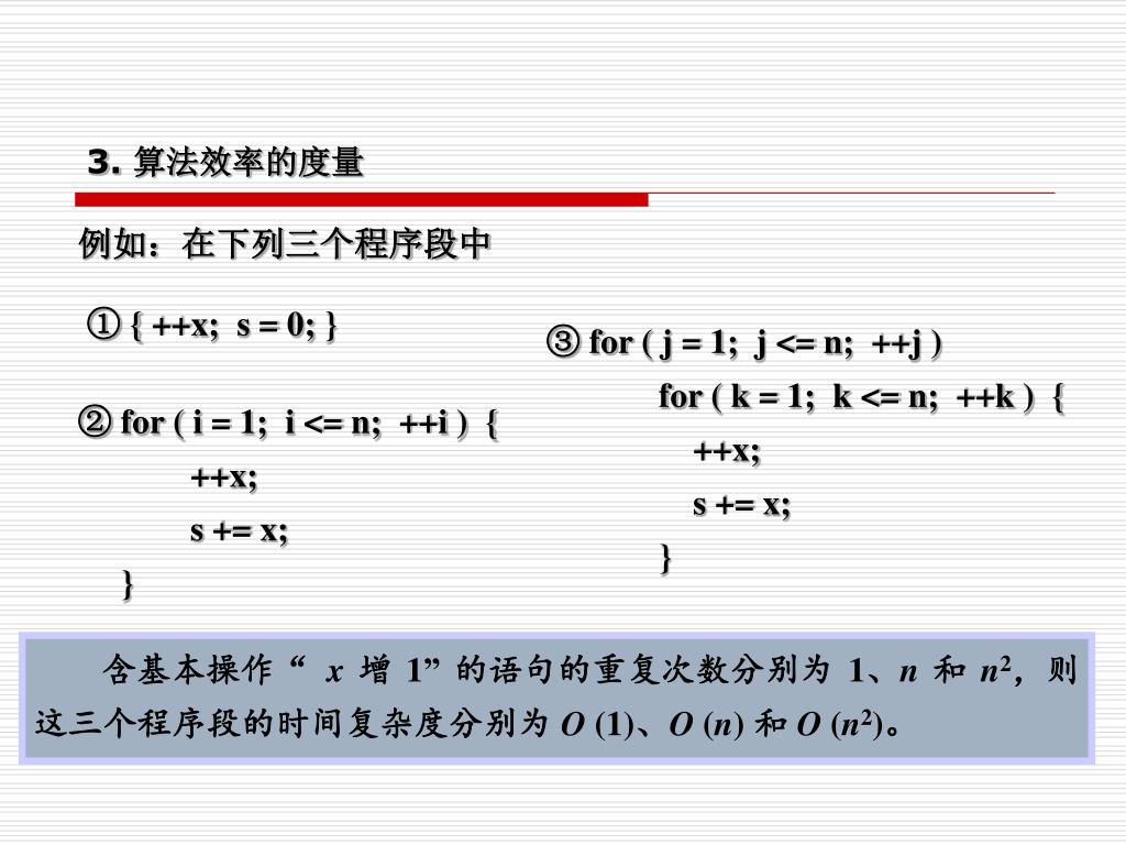 例如:在下列三个程序段中 3. 算法效率的度量 ① { ++x; s = 0; } ③ for ( j = 1; j <= n; ++j ) for ( k = 1; k <= n; ++k ) { ++x; s += x; } ② for ( i = 1; i <= n; ++i ) { ++x; s += x; } 含基本操作“x增 1” 的语句的重复次数分别为 1、n和 n2,则这三个程序段的时间复杂度分别为 O (1)、O (n) 和 O (n2)。