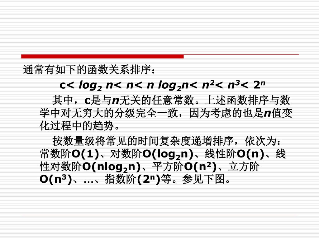 通常有如下的函数关系排序: c< log2 n< n< n log2n< n2< n3<2n 其中,c是与n无关的任意常数。上述函数排序与数学中对无穷大的分级完全一致,因为考虑的也是n值变化过程中的趋势。 按数量级将常见的时间复杂度递增排序,依次为:常数阶O(1)、对数阶O(log2n)、线性阶O(n)、线性对数阶O(nlog2n)、平方阶O(n2)、立方阶O(n3)、…、指数阶(2n)等。参见下图。