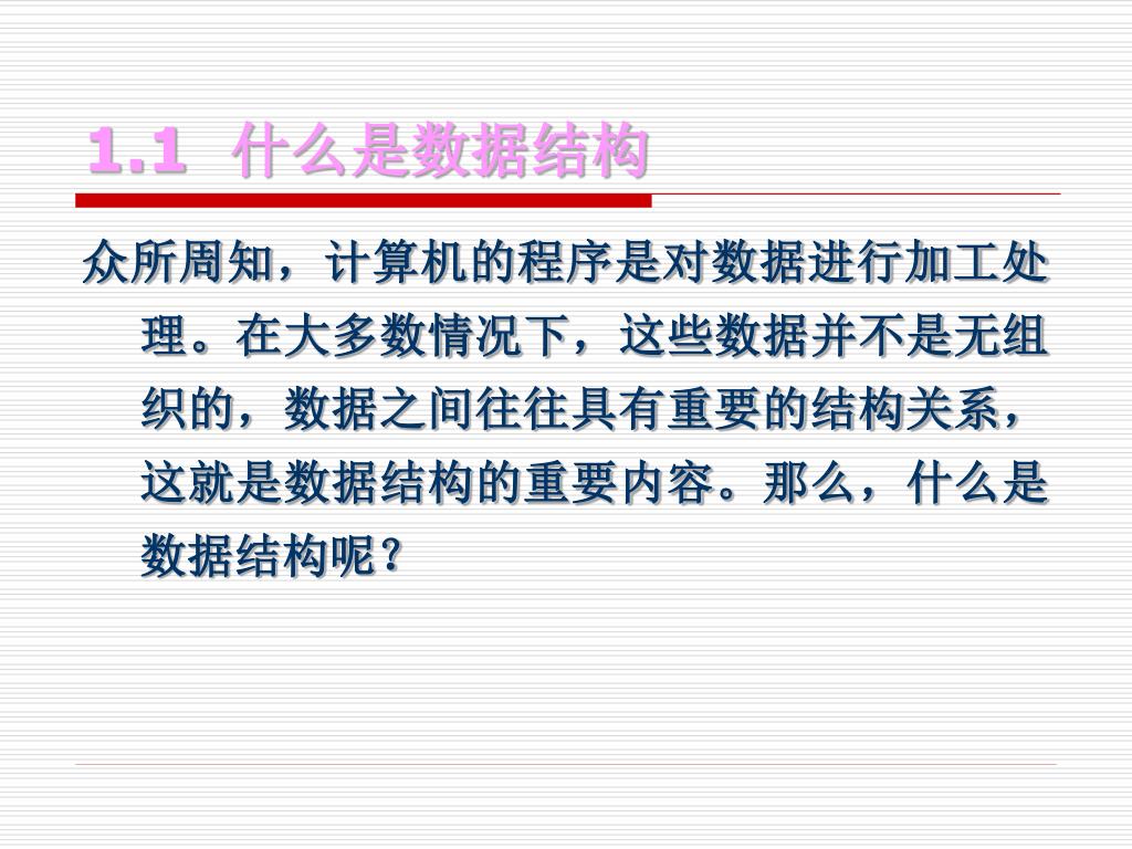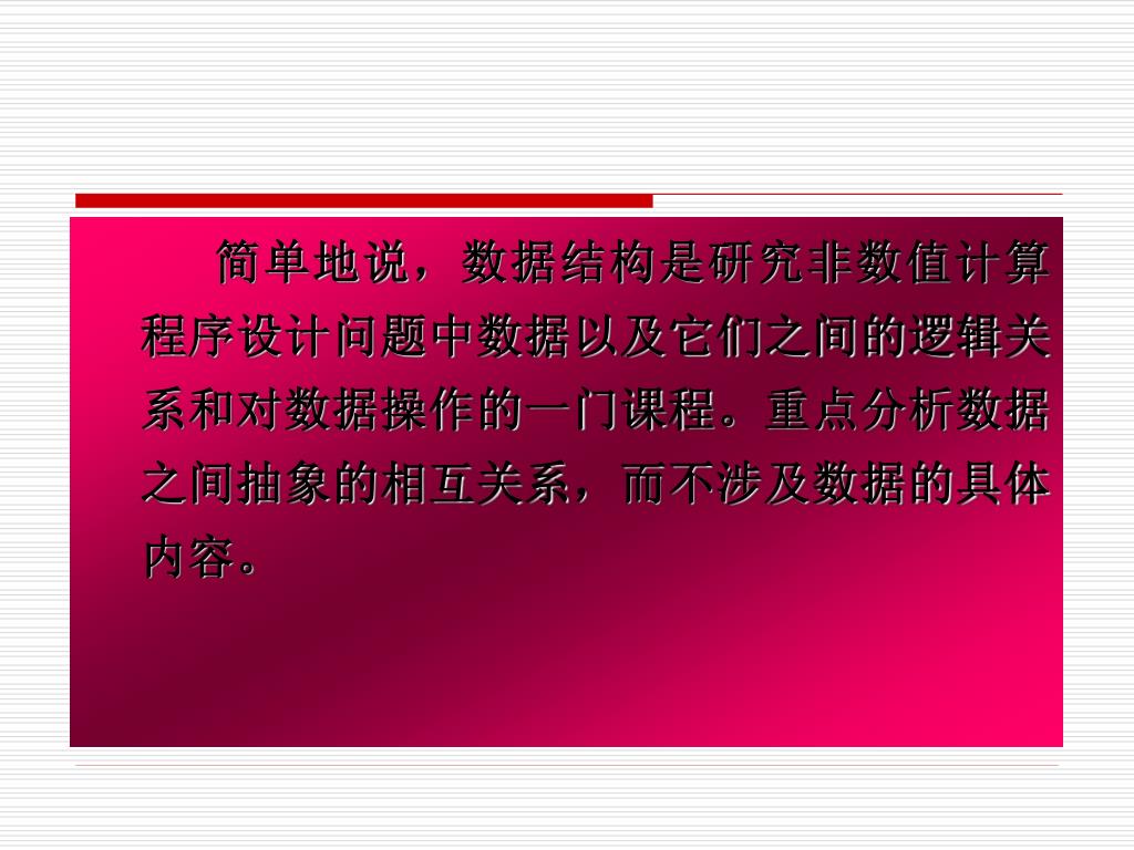 简单地说,数据结构是研究非数值计算程序设计问题中数据以及它们之间的逻辑关系和对数据操作的一门课程。重点分析数据之间抽象的相互关系,而不涉及数据的具体内容。简单地说,数据结构是研究非数值计算程序设计问题中数据以及它们之间的逻辑关系和对数据操作的一门课程。重点分析数据之间抽象的相互关系,而不涉及数据的具体内容。