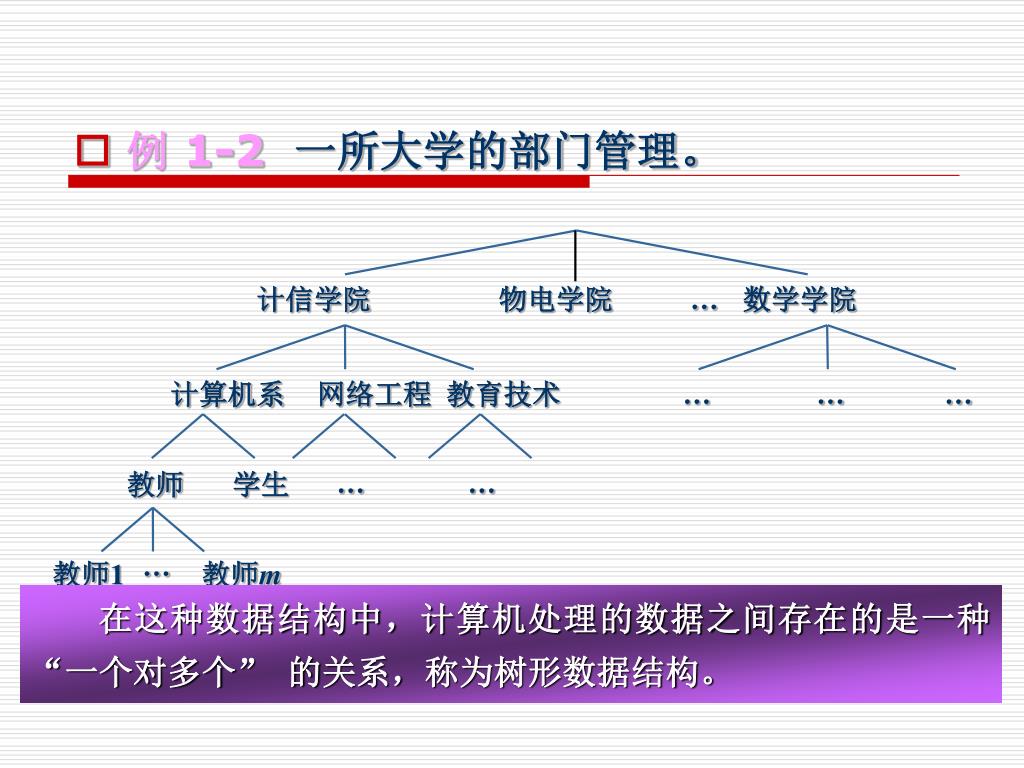 计信学院 物电学院 … 数学学院 计算机系 网络工程 教育技术 … … … … … 教师 学生 … 教师1 教师m • 例 1-2一所大学的部门管理。 在这种数据结构中,计算机处理的数据之间存在的是一种 “一个对多个” 的关系,称为树形数据结构。