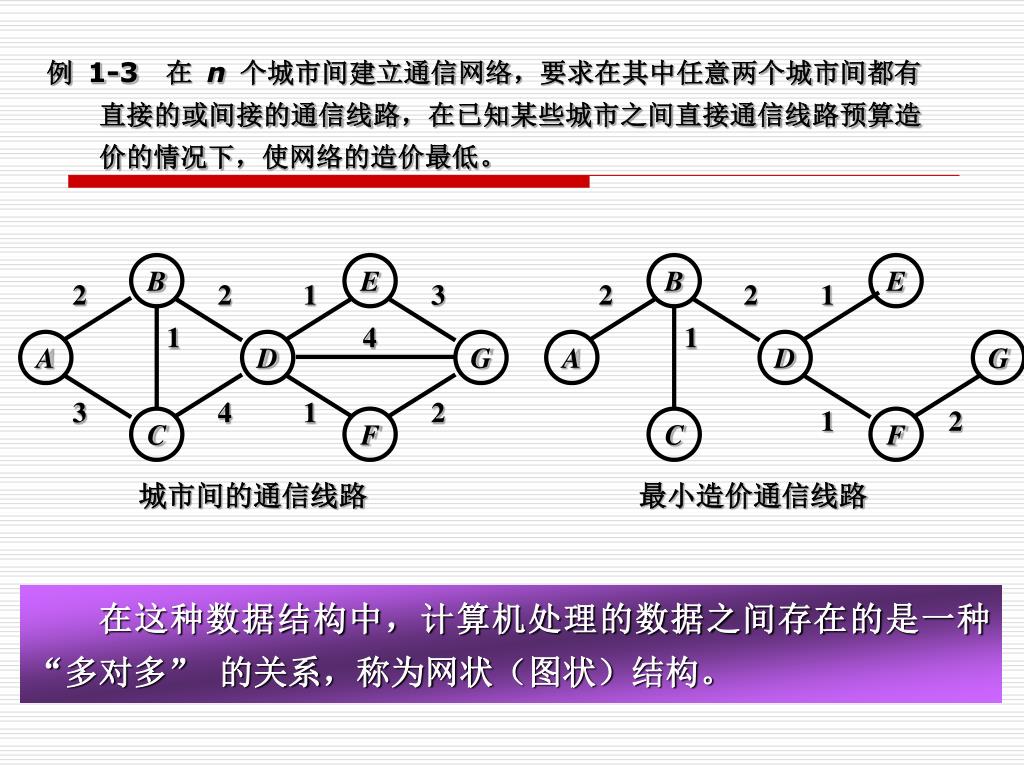B E B E 2 2 1 3 2 2 1 1 4 1 A D G A D G 3 4 1 2 1 2 C F C F 例 1-3 在 n个城市间建立通信网络,要求在其中任意两个城市间都有直接的或间接的通信线路,在已知某些城市之间直接通信线路预算造价的情况下,使网络的造价最低。 城市间的通信线路 最小造价通信线路 在这种数据结构中,计算机处理的数据之间存在的是一种 “多对多” 的关系,称为网状(图状)结构。