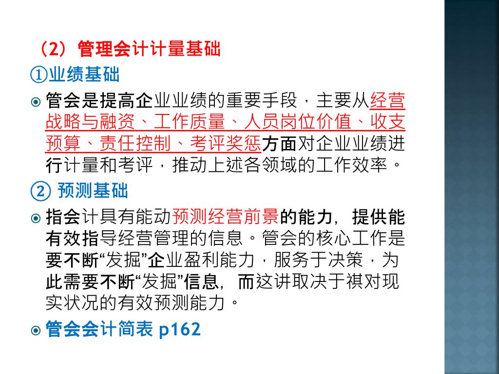 (2)管理会计计量基础 ①业绩基础 • 管会是提高企业业绩的重要手段,主要从经营战略与融资、工作质量、人员岗位价值、收支预算、责任控制、考评奖惩方面对企业业绩进行计量和考评,推动上述各领域的工作效率。 ② 预测基础 • 指会计具有能动预测经营前景的能力,提供能有效指导经营管理的信息。管会的核心工作是要不断“发掘”企业盈利能力,服务于决策,为此需要不断“发掘”信息,而这讲取决于祺对现实状况的有效预测能力。 • 管会会计简表 p162
