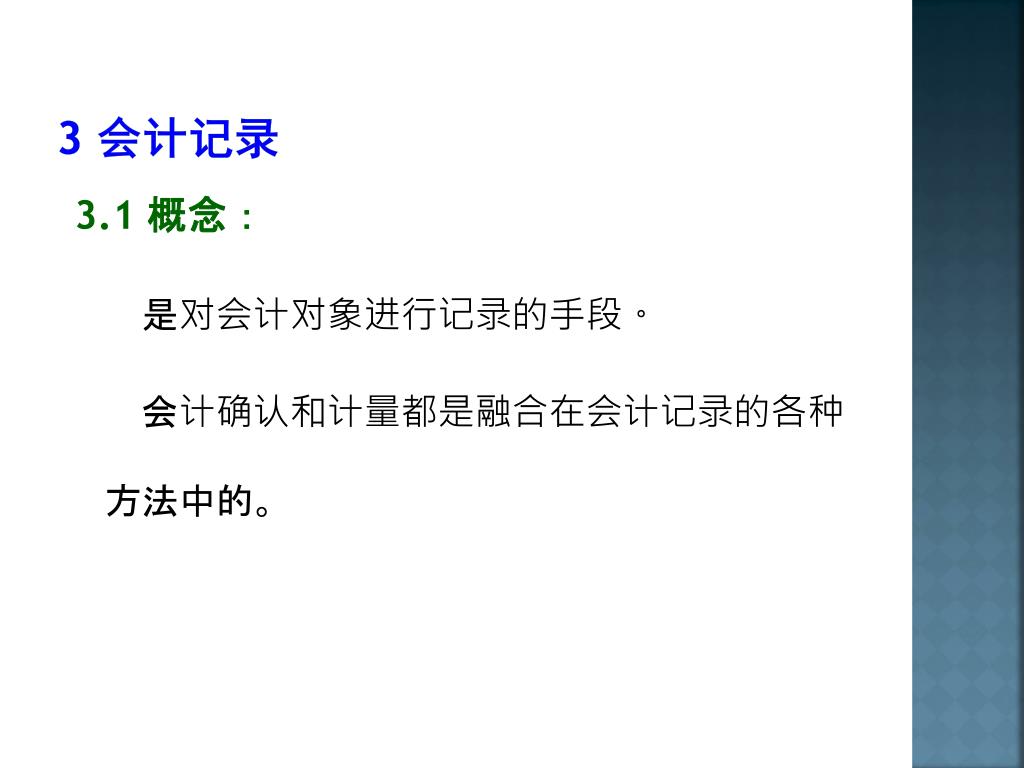 3 会计记录 3.1 概念: 是对会计对象进行记录的手段。 会计确认和计量都是融合在会计记录的各种方法中的。