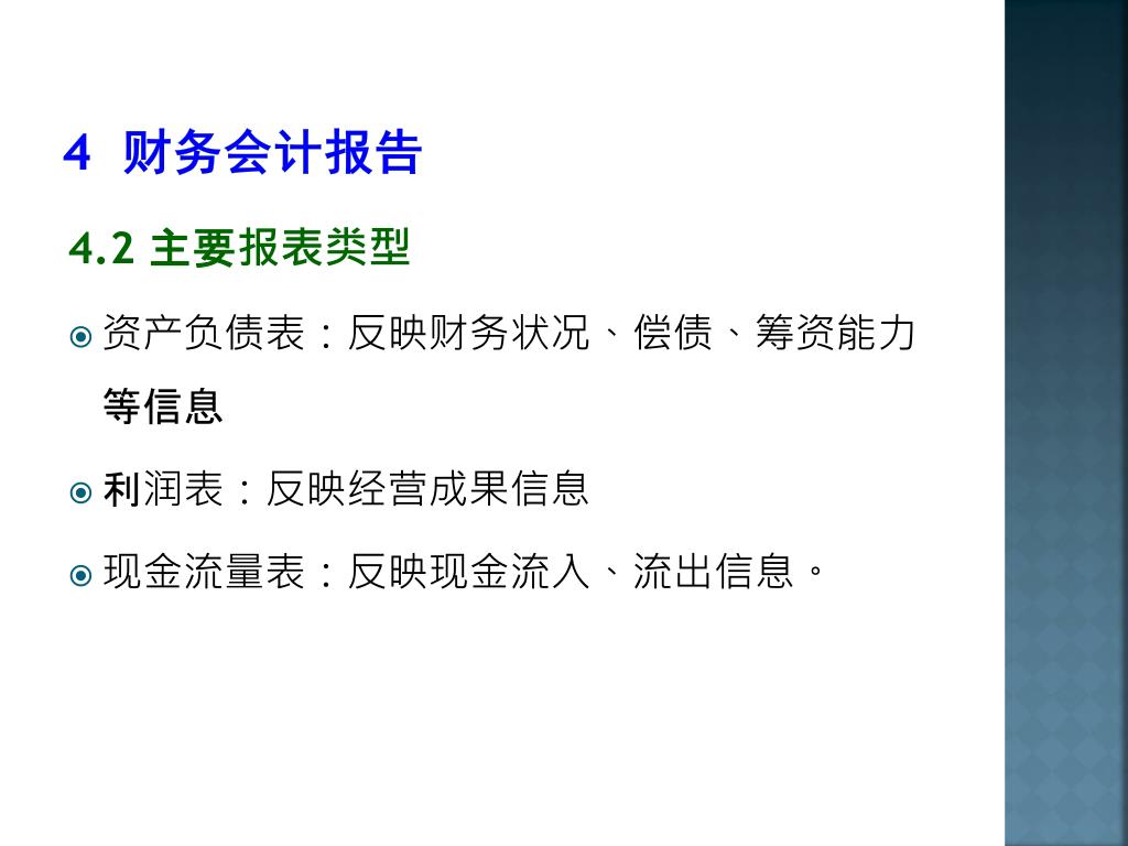 4 财务会计报告 4.2 主要报表类型 • 资产负债表:反映财务状况、偿债、筹资能力等信息 • 利润表:反映经营成果信息 • 现金流量表:反映现金流入、流出信息。