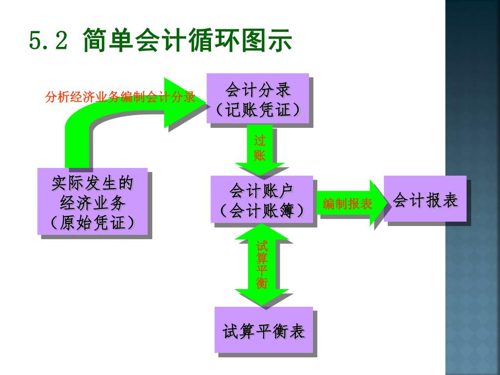 会计分录 (记账凭证) 过 账 实际发生的 经济业务 (原始凭证) 会计账户 (会计账簿) 会计报表 编制报表 试算平衡 试算平衡表 5.2 简单会计循环图示 分析经济业务编制会计分录