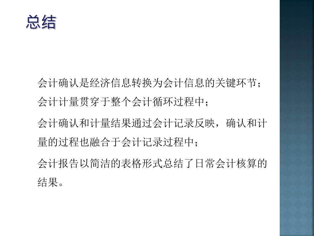 总结 会计确认是经济信息转换为会计信息的关键环节;会计计量贯穿于整个会计循环过程中; 会计确认和计量结果通过会计记录反映,确认和计量的过程也融合于会计记录过程中; 会计报告以简洁的表格形式总结了日常会计核算的结果。