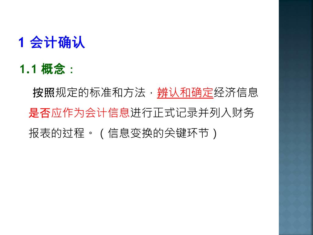 1 会计确认 1.1 概念: 按照规定的标准和方法,辨认和确定经济信息是否应作为会计信息进行正式记录并列入财务报表的过程。(信息变换的关键环节)