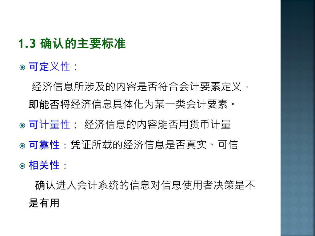 1.3 确认的主要标准 • 可定义性: 经济信息所涉及的内容是否符合会计要素定义,即能否将经济信息具体化为某一类会计要素。 • 可计量性: 经济信息的内容能否用货币计量 • 可靠性:凭证所载的经济信息是否真实、可信 • 相关性: 确认进入会计系统的信息对信息使用者决策是不是有用