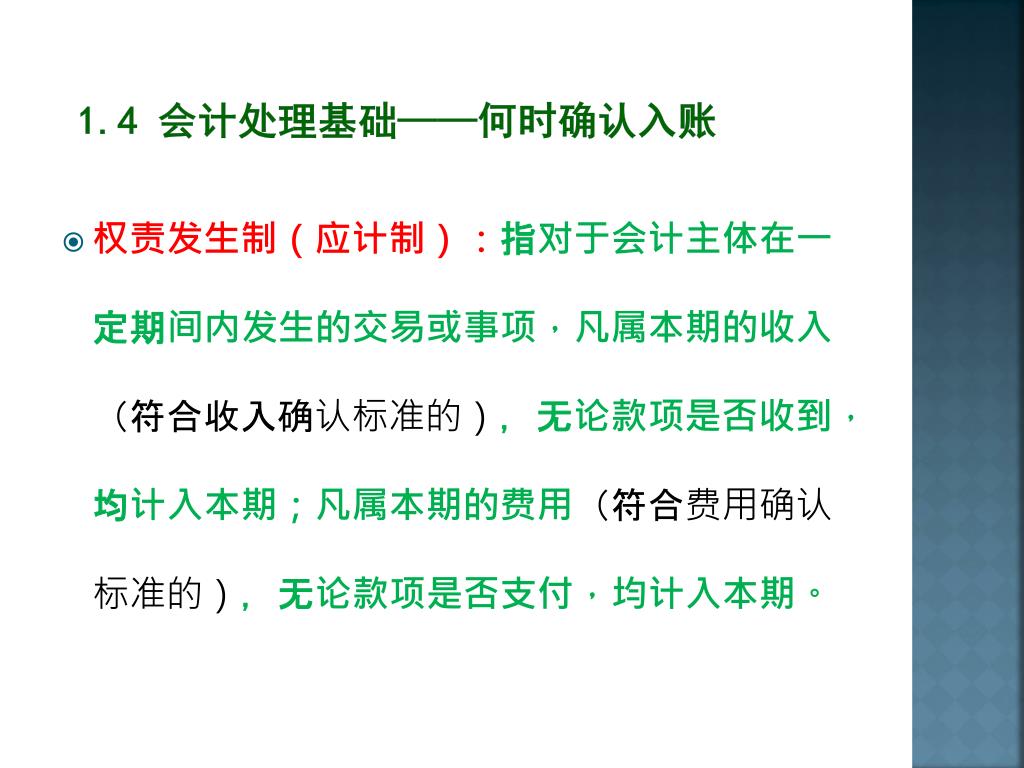 1.4 会计处理基础——何时确认入账 • 权责发生制(应计制):指对于会计主体在一定期间内发生的交易或事项,凡属本期的收入(符合收入确认标准的),无论款项是否收到,均计入本期;凡属本期的费用(符合费用确认标准的),无论款项是否支付,均计入本期。