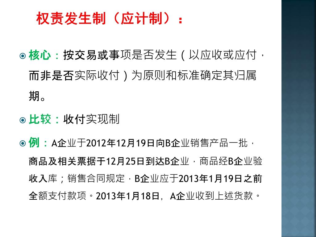 权责发生制(应计制): • 核心:按交易或事项是否发生(以应收或应付,而非是否实际收付)为原则和标准确定其归属期。 • 比较:收付实现制 • 例:A企业于2012年12月19日向B企业销售产品一批,商品及相关票据于12月25日到达B企业,商品经B企业验收入库;销售合同规定,B企业应于2013年1月19日之前全额支付款项。2013年1月18日,A企业收到上述货款。