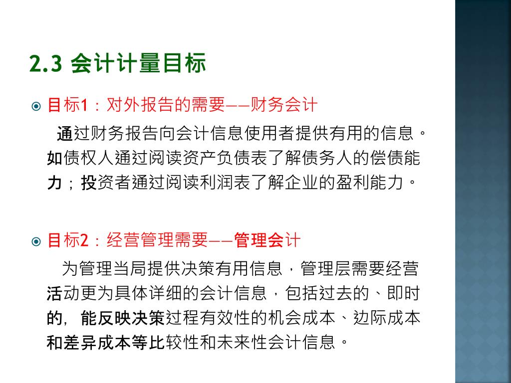 2.3 会计计量目标 • 目标1:对外报告的需要——财务会计 通过财务报告向会计信息使用者提供有用的信息。如债权人通过阅读资产负债表了解债务人的偿债能力;投资者通过阅读利润表了解企业的盈利能力。 • 目标2:经营管理需要——管理会计 为管理当局提供决策有用信息,管理层需要经营活动更为具体详细的会计信息,包括过去的、即时的,能反映决策过程有效性的机会成本、边际成本和差异成本等比较性和未来性会计信息。