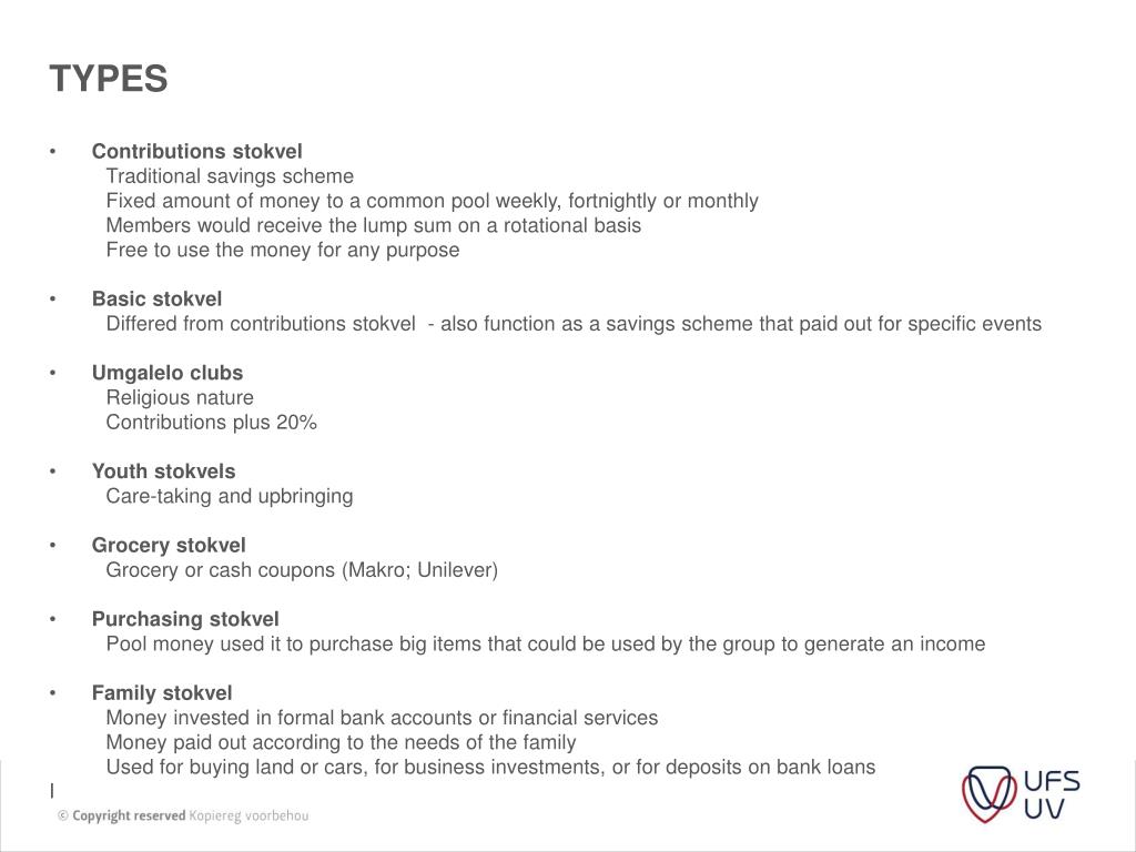 STOKVELS. Definition. Group of people Enter into an agreement to pledge regular contributions to a common fund Each member can draw from fund for a specific purpose On a rotating basis or times of financial need. TYPES. Contributions stokvel Traditional savings scheme