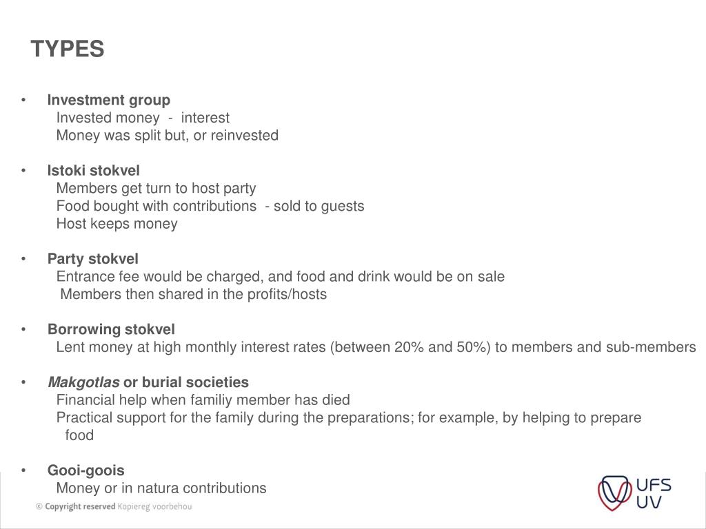 TYPES • Investment group Invested money - interest Money was split but, or reinvested • Istokistokvel Members get turn to host party Food bought with contributions - sold to guests Host keeps money • Party stokvel Entrance fee would be charged, and food and drink would be on sale Members then shared in the profits/hosts • Borrowing stokvel Lent money at high monthly interest rates (between 20% and 50%) to members and sub-members • Makgotlasor burial societies Financial help when familiy member has died Practical support for the family during the preparations; for example, by helping to prepare food • Gooi-goois Money or in natura contributions
