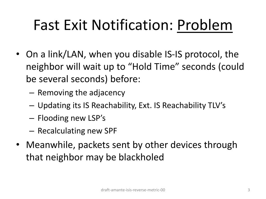 Fast Exit Notification: Problem • On a link/LAN, when you disable IS-IS protocol, the neighbor will wait up to “Hold Time” seconds (could be several seconds) before: • Removing the adjacency • Updating its IS Reachability, Ext. IS Reachability TLV’s • Flooding new LSP’s • Recalculating new SPF • Meanwhile, packets sent by other devices through that neighbor may be blackholed draft-amante-isis-reverse-metric-00