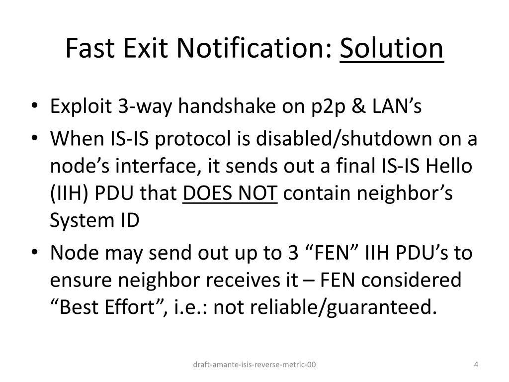 Fast Exit Notification: Solution • Exploit 3-way handshake on p2p & LAN’s • When IS-IS protocol is disabled/shutdown on a node’s interface, it sends out a final IS-IS Hello (IIH) PDU that DOES NOT contain neighbor’s System ID • Node may send out up to 3 “FEN” IIH PDU’s to ensure neighbor receives it – FEN considered “Best Effort”, i.e.: not reliable/guaranteed. draft-amante-isis-reverse-metric-00