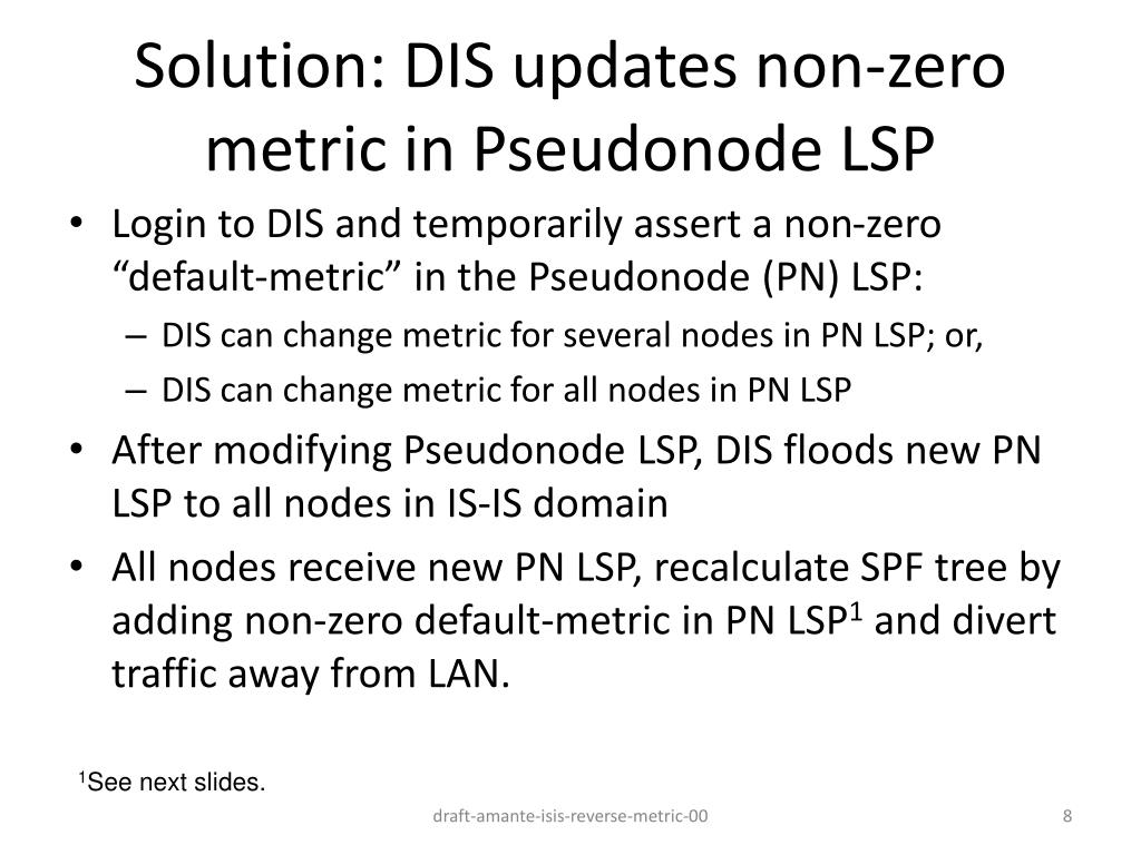 Solution: DIS updates non-zero metric in Pseudonode LSP • Login to DIS and temporarily assert a non-zero “default-metric” in the Pseudonode (PN) LSP: • DIS can change metric for several nodes in PN LSP; or, • DIS can change metric for all nodes in PN LSP • After modifying Pseudonode LSP, DIS floods new PN LSP to all nodes in IS-IS domain • All nodes receive new PN LSP, recalculate SPF tree by adding non-zero default-metric in PN LSP1 and divert traffic away from LAN. 1See next slides. draft-amante-isis-reverse-metric-00