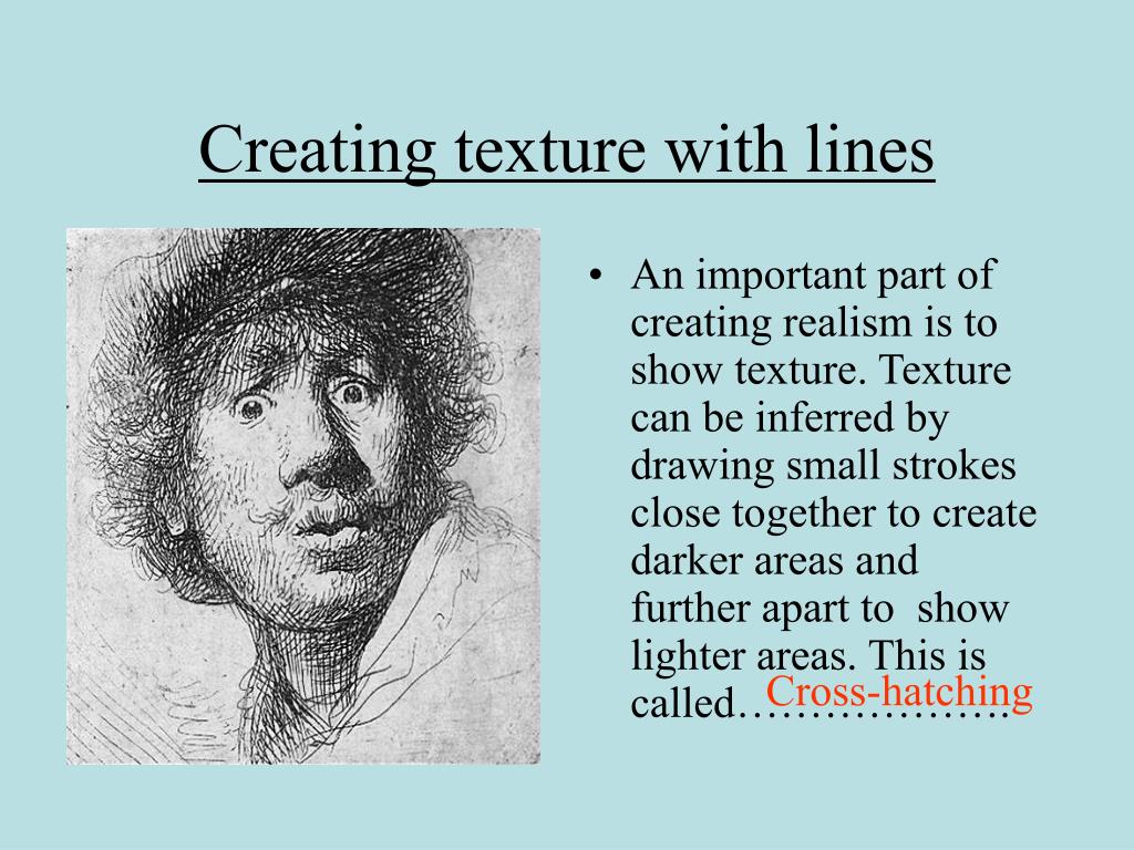 Creating texture with lines • An important part of creating realism is to show texture. Texture can be inferred by drawing small strokes close together to create darker areas and further apart to show lighter areas. This is called………………. Cross-hatching