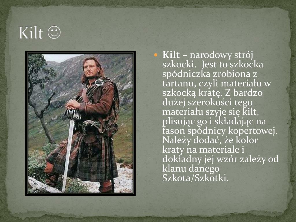 Kilt • Kilt – narodowy strój szkocki. Jest to szkocka spódniczkazrobiona z tartanu, czyli materiału w szkocką kratę. Z bardzo dużej szerokości tego materiału szyje się kilt, plisując go i składając na fason spódnicy kopertowej. Należy dodać, że kolor kraty na materiale i dokładny jej wzór zależy od klanu danego Szkota/Szkotki.