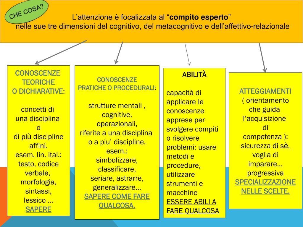 L’attenzione è focalizzata al “compito esperto” nelle sue tre dimensioni del cognitivo, del metacognitivo e dell’affettivo-relazionale CONOSCENZE TEORICHE O DICHIARATIVE: concetti di una disciplina o di più discipline affini. esem. lin. ital.: testo, codice verbale, morfologia, sintassi, lessico … SAPERE CONOSCENZE PRATICHE O PROCEDURALI: strutture mentali , cognitive, operazionali, riferite a una disciplina o a piu’ discipline. esem.: simbolizzare, classificare, seriare, astrarre, generalizzare… SAPERE COME FARE QUALCOSA. ABILITÀ capacità di applicare le conoscenze apprese per svolgere compiti o risolvere problemi: usare metodi e procedure, utilizzare strumenti e macchine ESSERE ABILI A FARE QUALCOSA ATTEGGIAMENTI ( orientamento che guida l’acquisizione di competenza ): sicurezza di sè, voglia di imparare… progressiva SPECIALIZZAZIONE NELLE SCELTE.