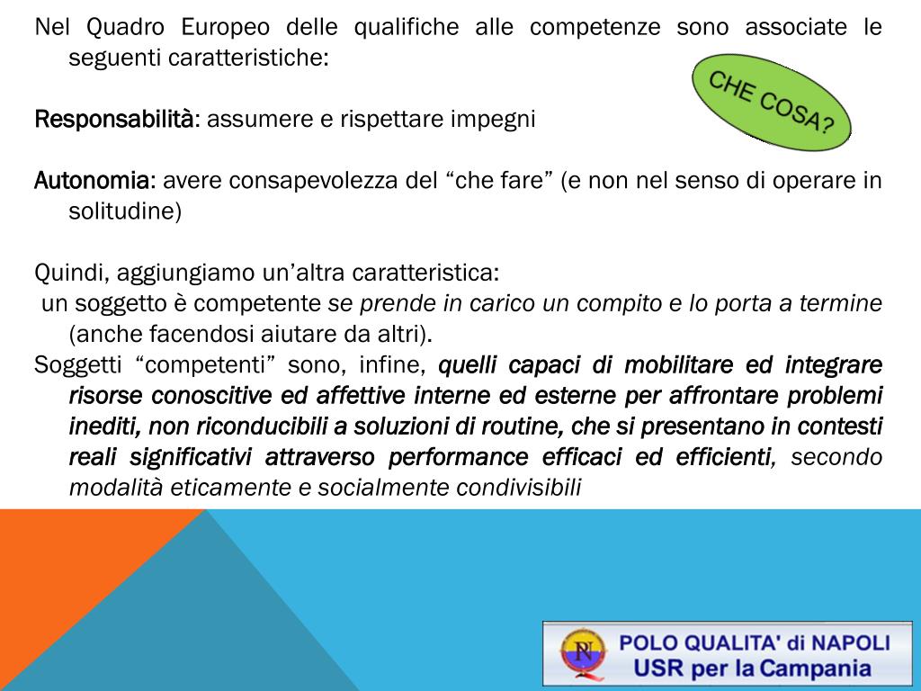 Nel Quadro Europeo delle qualifiche alle competenze sono associate le seguenti caratteristiche: Responsabilità: assumere e rispettare impegni Autonomia: avere consapevolezza del “che fare” (e non nel senso di operare in solitudine) Quindi, aggiungiamo un’altra caratteristica: un soggetto è competente se prende in carico un compito e lo porta a termine (anche facendosi aiutare da altri). Soggetti “competenti” sono, infine, quelli capaci di mobilitare ed integrare risorse conoscitive ed affettive interne ed esterne per affrontare problemi inediti, non riconducibili a soluzioni di routine, che si presentano in contesti reali significativi attraverso performance efficaci ed efficienti, secondo modalità eticamente e socialmente condivisibili