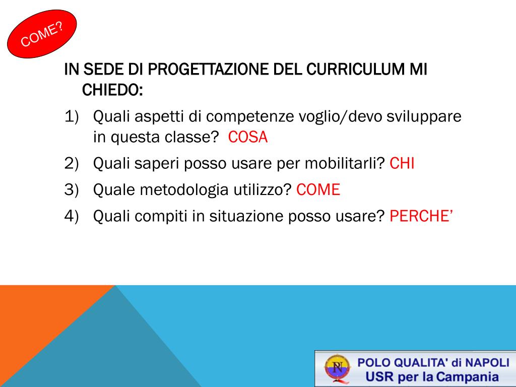 COME? IN SEDE DI PROGETTAZIONE DEL CURRICULUM MI CHIEDO: • Quali aspetti di competenze voglio/devo sviluppare in questa classe? COSA • Quali saperi posso usare per mobilitarli? CHI • Quale metodologia utilizzo? COME • Quali compiti in situazione posso usare? PERCHE’