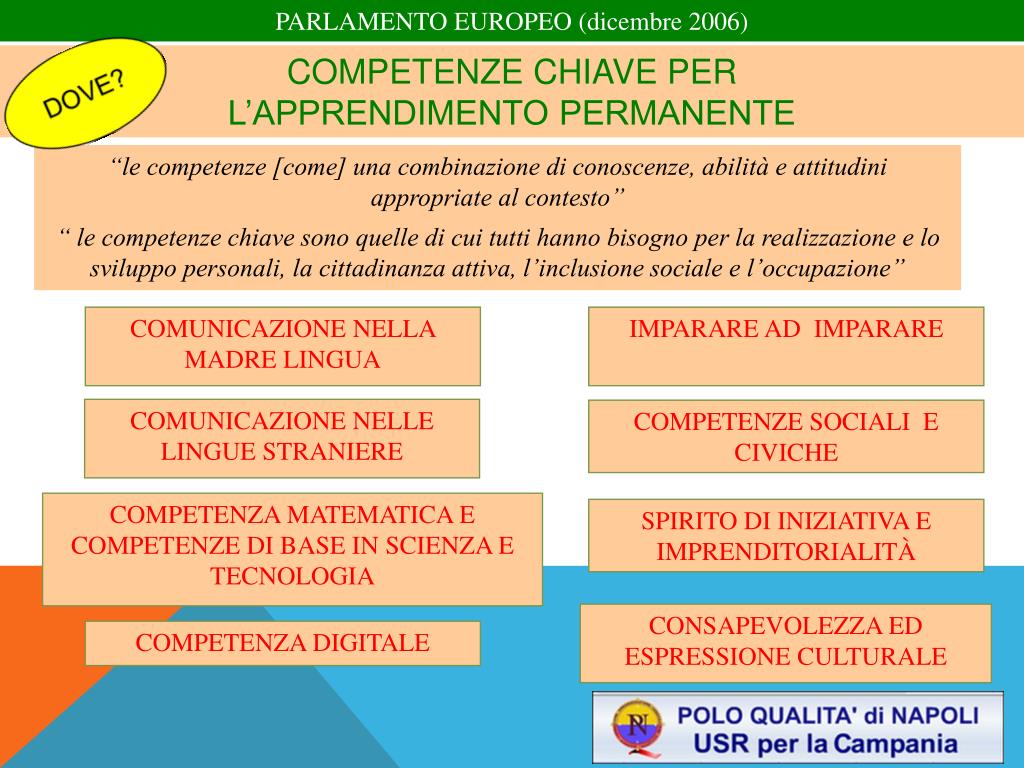 È in questo contesto che, alla fine del 2006, il Consiglio e il Parlamento europeo hanno adottato un quadro europeo relativo alle competenze chiave per l’apprendimento permanente. (Raccomandazione del Parlamento europeo e del Consiglio del 18 dicembre 2006 relativa a competenze chiave per l’apprendimento permanente- Gazzetta ufficiale dell’Unione europea L394.) Il quadro individua e definisce per la prima volta a livello europeo le competenze chiave che i cittadini devono possedere per la propria realizzazione personale, l’inclusione sociale, la cittadinanza attiva e l’ occupabilità nella nostra società basata sulla conoscenza. I sistemi iniziali di istruzione e di formazione degli Stati membri devono sostenere lo sviluppo di tali competenze per tutti i giovani; inoltre, l’istruzione e la formazione per adulti devono offrire opportunità reali a tutti di apprendere e mantenere queste capacità e competenze.