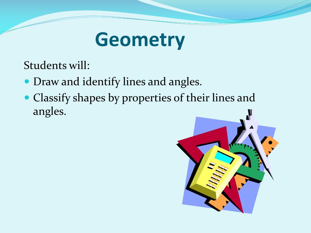 Geometry Students will: Draw and identify lines and angles. Classify shapes by properties of their lines and angles.