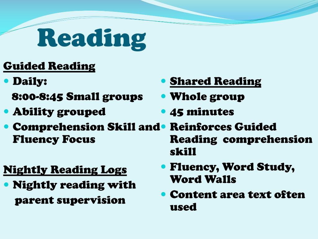 Reading Guided Reading • Daily: 8:00-8:45 Small groups • Ability grouped • Comprehension Skill and Fluency Focus Nightly Reading Logs • Nightly reading with parent supervision • Shared Reading • Whole group • 45 minutes • Reinforces Guided Reading comprehension skill • Fluency, Word Study, Word Walls • Content area text often used