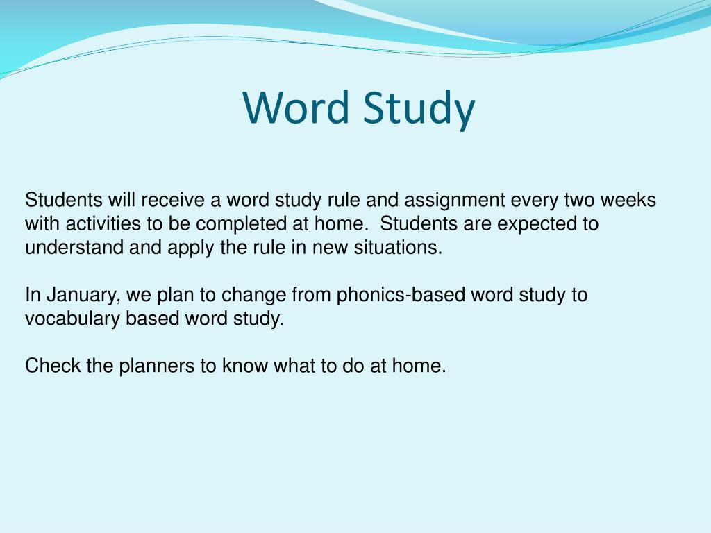 Word Study Students will receive a word study rule and assignment every two weeks with activities to be completed at home. Students are expected to understand and apply the rule in new situations. In January, we plan to change from phonics-based word study to vocabulary based word study. Check the planners to know what to do at home.