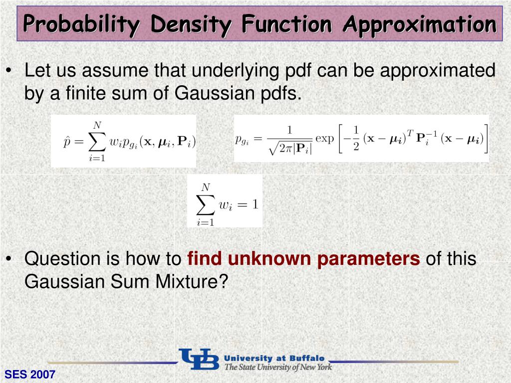 Probability Density Function Approximation • Let us assume that underlying pdf can be approximated by a finite sum of Gaussian pdfs. • Question is how to find unknown parameters of this Gaussian Sum Mixture?