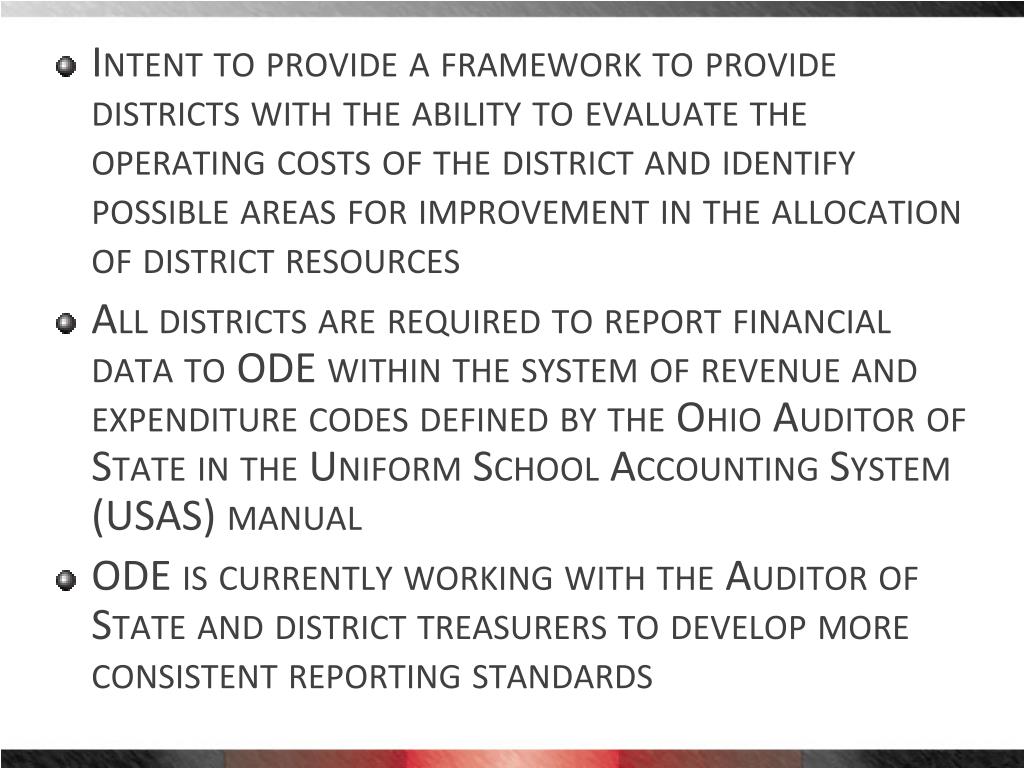 Intent to provide a framework to provide districts with the ability to evaluate the operating costs of the district and identify possible areas for improvement in the allocation of district resources • All districts are required to report financial data to ODE within the system of revenue and expenditure codes defined by the Ohio Auditor of State in the Uniform School Accounting System (USAS) manual • ODE is currently working with the Auditor of State and district treasurers to develop more consistent reporting standards
