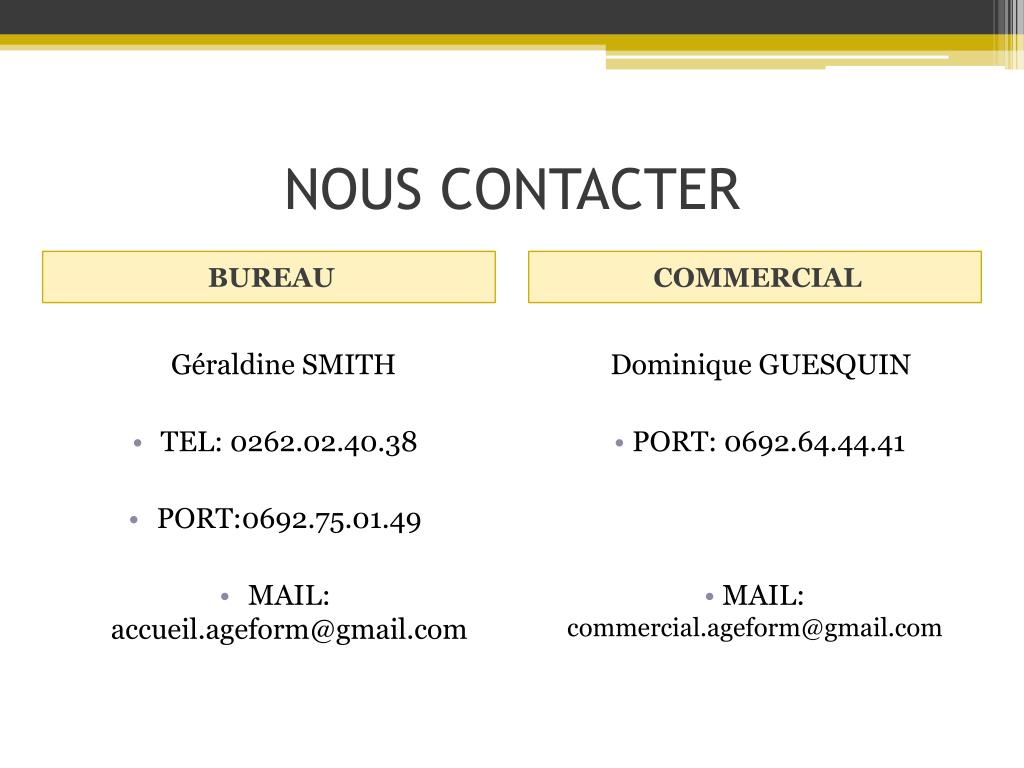 NOUS CONTACTER BUREAU COMMERCIAL Géraldine SMITH • TEL: 0262.02.40.38 • PORT:0692.75.01.49 • MAIL: accueil.ageform@gmail.com Dominique GUESQUIN • PORT: 0692.64.44.41 • MAIL: commercial.ageform@gmail.com