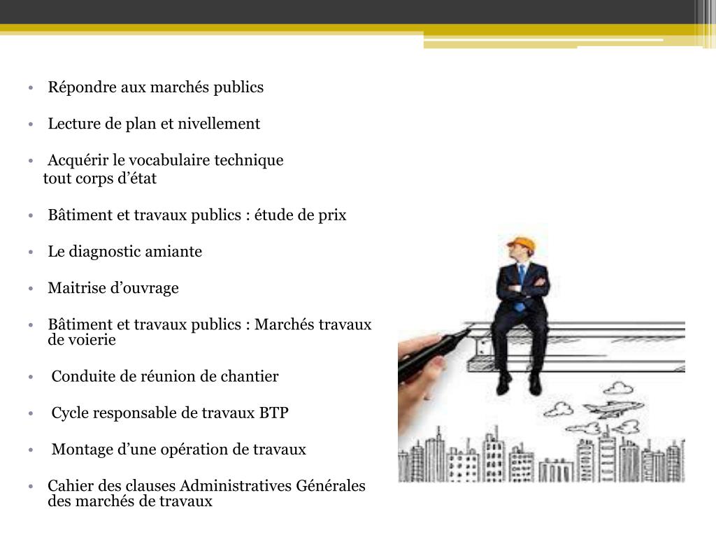 Répondre aux marchés publics • Lecture de plan et nivellement • Acquérir le vocabulaire technique tout corps d’état • Bâtiment et travaux publics : étude de prix • Le diagnostic amiante • Maitrise d’ouvrage • Bâtiment et travaux publics : Marchés travaux de voierie • Conduite de réunion de chantier • Cycle responsable de travaux BTP • Montage d’une opération de travaux • Cahier des clauses Administratives Générales des marchés de travaux