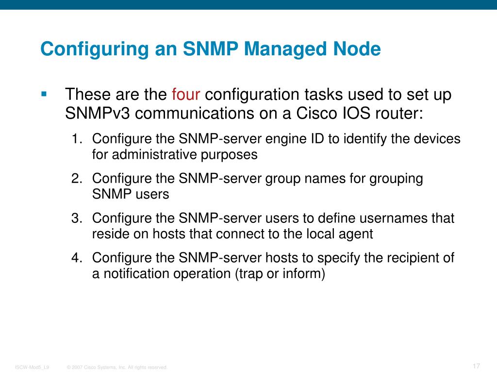 Configuring an SNMP Managed Node • These are the four configuration tasks used to set up SNMPv3 communications on a Cisco IOS router: • Configure the SNMP-server engine ID to identify the devices for administrative purposes • Configure the SNMP-server group names for grouping SNMP users • Configure the SNMP-server users to define usernames that reside on hosts that connect to the local agent • Configure the SNMP-server hosts to specify the recipient of a notification operation (trap or inform)