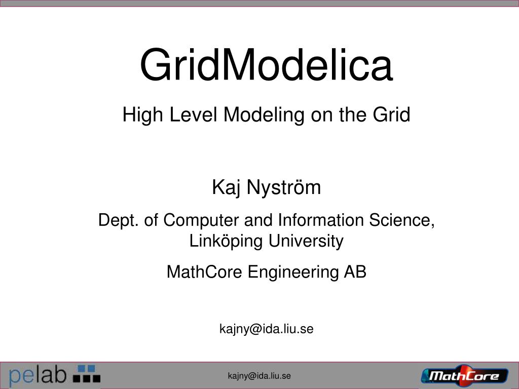 GridModelica High Level Modeling on the Grid Kaj Nyström Dept. of Computer and Information Science, Linköping University MathCore Engineering AB kajny@ida.liu.se kajny@ida.liu.se