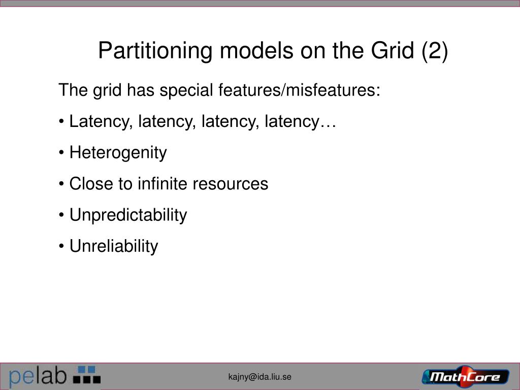 Partitioning models on the Grid (2) • The grid has special features/misfeatures: • Latency, latency, latency, latency… • Heterogenity • Close to infinite resources • Unpredictability • Unreliability kajny@ida.liu.se