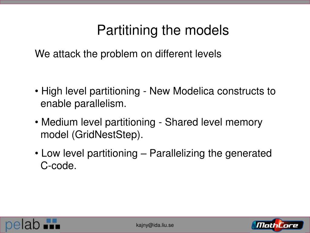 Partitining the models • We attack the problem on different levels • High level partitioning - New Modelica constructs to enable parallelism. • Medium level partitioning - Shared level memory model (GridNestStep). • Low level partitioning – Parallelizing the generated C-code. kajny@ida.liu.se