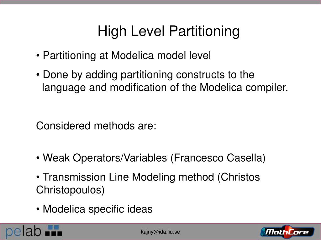 High Level Partitioning • Partitioning at Modelica model level • Done by adding partitioning constructs to the language and modification of the Modelica compiler. • Considered methods are: • Weak Operators/Variables (Francesco Casella) • Transmission Line Modeling method (Christos Christopoulos) • Modelica specific ideas kajny@ida.liu.se